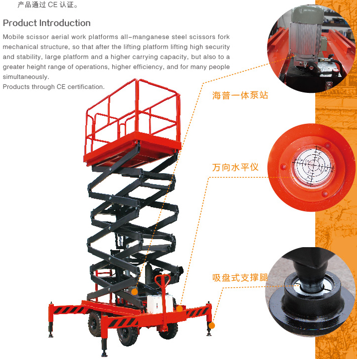 移動剪叉式高空作業平臺采用全錳鋼剪刀式機械結構,使升降臺起升后有很高的安全穩定性,寬大的作業平臺和較高的承載能力,也使高空作業范圍更大,效率更高,并適合多人同時作業。